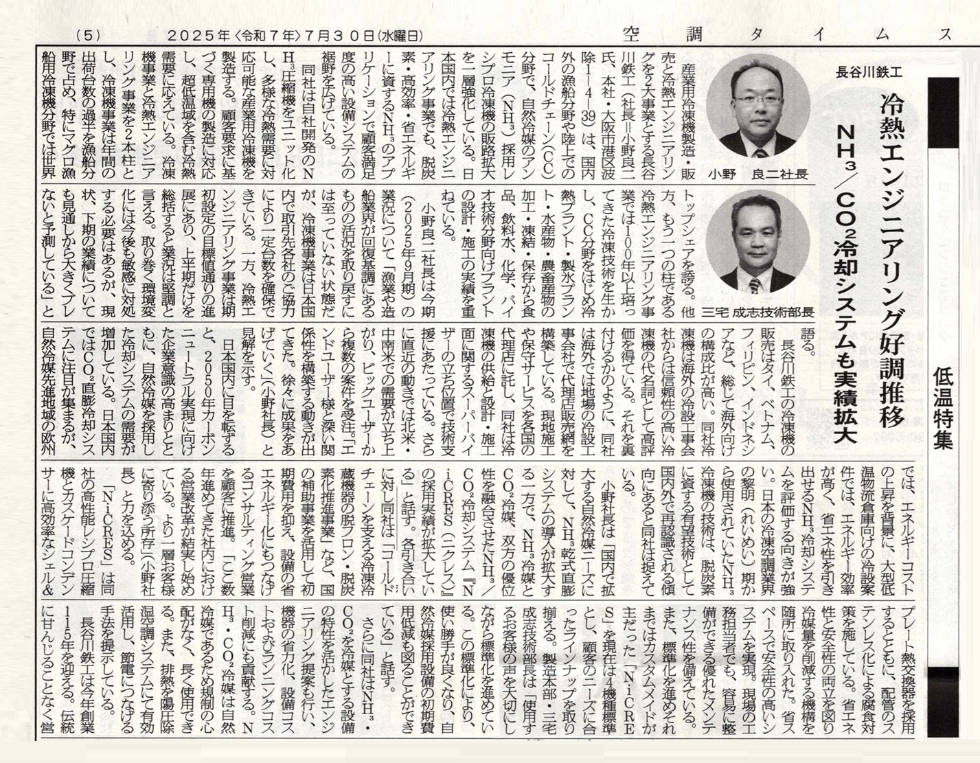 空調タイムスR7年7月30日号 『2025 低温・冷却器特集』として 「冷熱エンジニアリング好調推移 NH3/CO2冷却システムも実績拡大」が掲載されました。