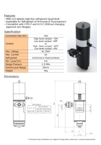 Our refrigerant level control switch is a high-precision control device designed to ensure proper refrigerant level management—essential for stable refrigeration system operation. Built on decades of experience in designing, installing, and operating refrigeration facilities, it delivers the reliability, durability, and ease of use demanded in real-world applications.