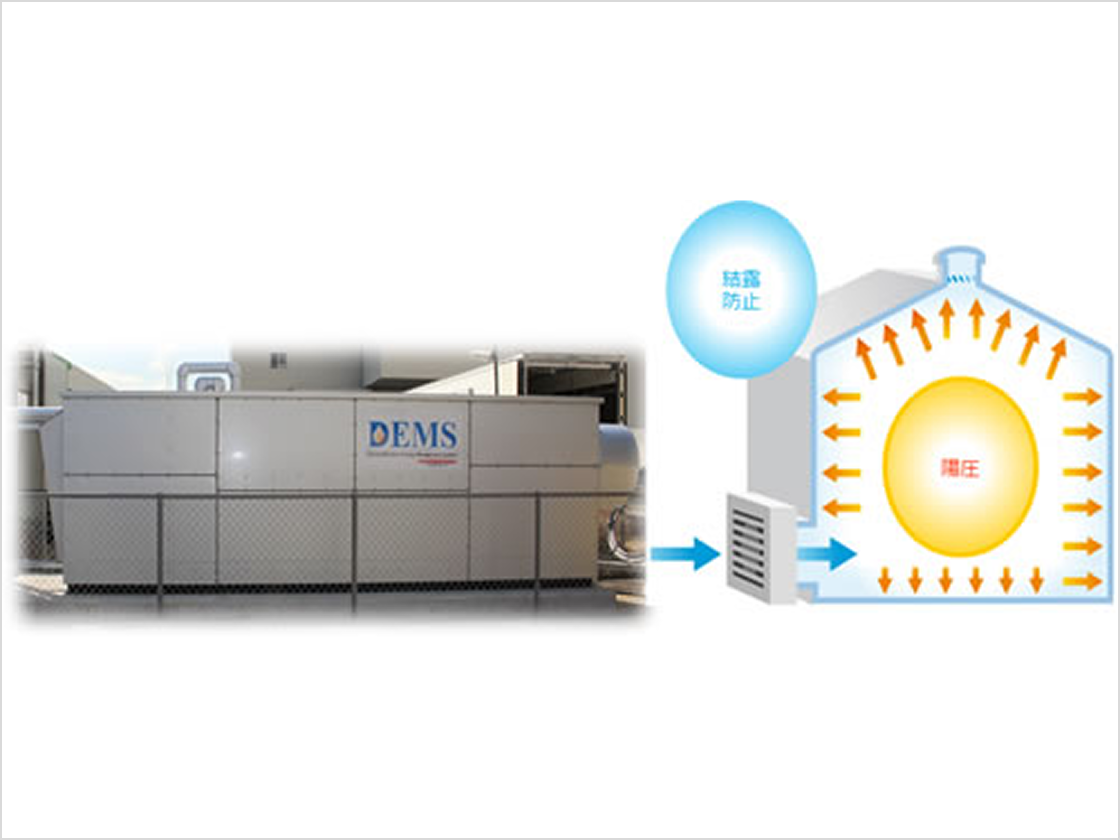 陽圧除湿空調システム(DEMS)は、冷却コイルによる結露式除湿と陽圧制御を組み合わせ、清潔で快適な空気環境を効率的に実現しております。冷却コイルで空気を露点以下まで冷却して水分を除去し、処理した空気を適切に供給することで室内を陽圧に保ち、外気の侵入を抑制します。この仕組みにより、ホコリや花粉、外気汚染物質の流入を防ぎながら湿度を安定してコントロールでき、カビや結露の発生を抑制し製品品質や作業環境の向上に寄与します。