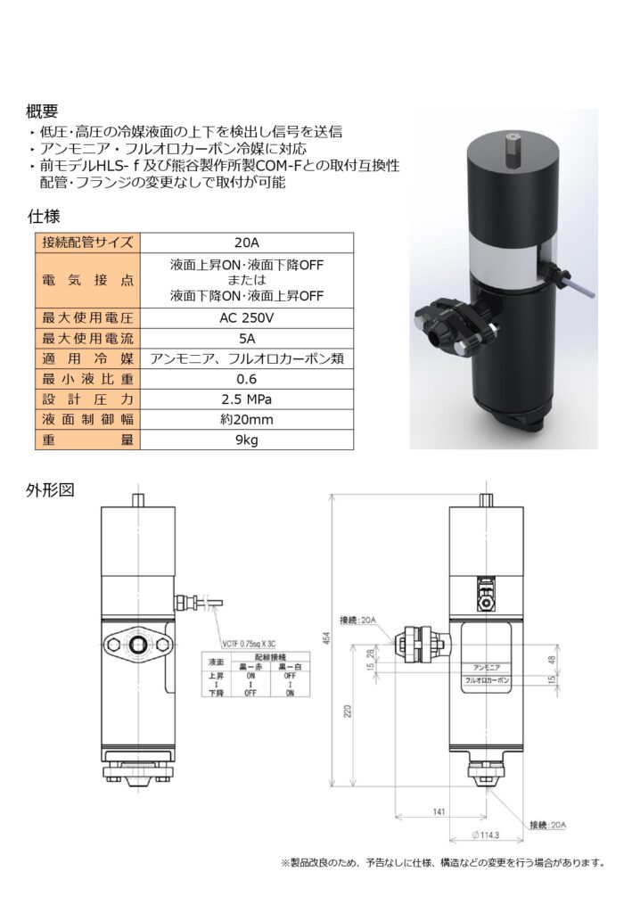 当社の冷媒用液面制御スイッチは、冷凍機の安定運転に欠かせない“冷媒液面の適正管理”を高精度で実現する制御デバイスです。当社が長年にわたり冷凍・冷蔵設備の設計・施工・運用に携わる中で培ってきた知識と経験をもとに、現場で求められる信頼性・耐久性・操作性を徹底的に追求しています。
