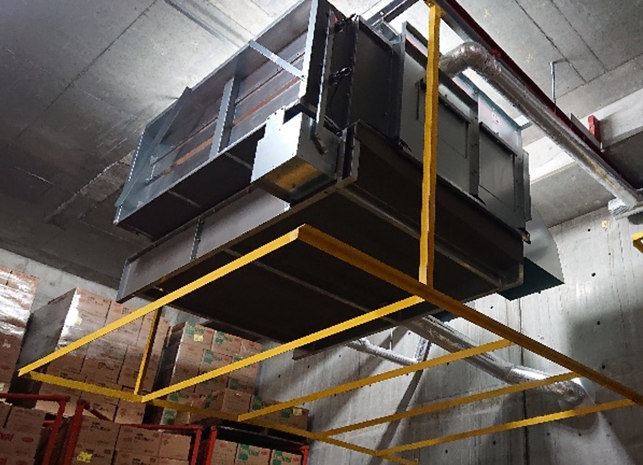 以前、F級倉庫には10台のフロン冷媒冷凍機を使用されていたが、環境に配慮した冷媒であるアンモニア(NH₃)と二酸化炭素(CO₂)を組み合わせたカスケード方式の自然冷媒システム「NiCRES」を導入し、冷凍機台数を2台に集約致しました。